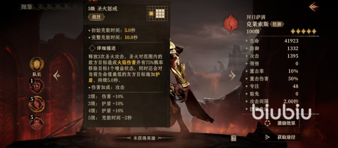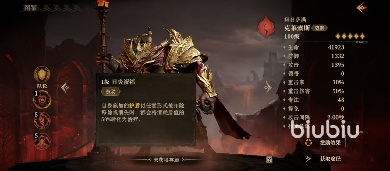 如果拜日萨满克莱索斯作为队长,那么队友将获得一级防御光环,但只有在历练之域战斗中才能生效,提升45%防御,所以大多数时候并不是队长的人选。被动技能日炎祝福,自身施加的护盾消失的时候,会将消耗的护盾值50%转化为治疗,也就是护盾无疑问是时间到了,或是被对方移除,或是被对方击破,都会转化成治疗。这样护盾就有了后续的额外效果,也算是对团队的加强。