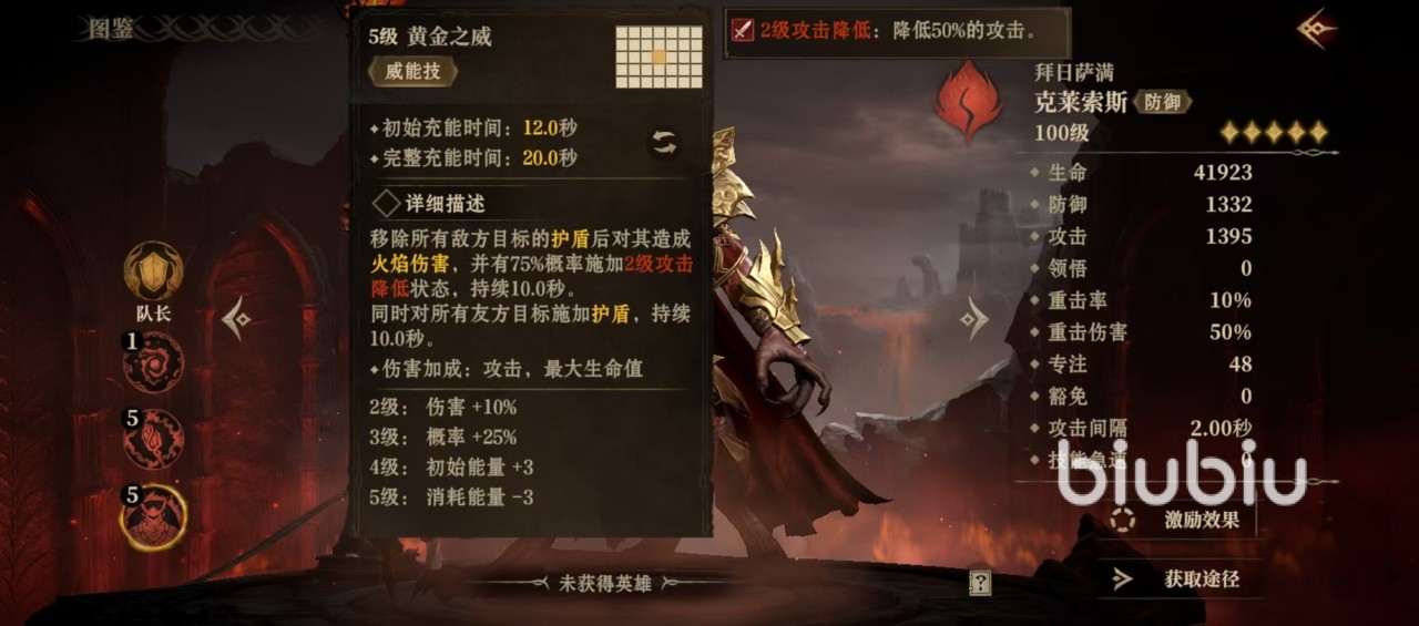 战技圣火惩戒,连续释放三次圣火攻击,对前方范围内的敌方目标造成火焰伤害,有75%率将目标身上的一个增益状态移除,同时对我方生命值最低的目标添加护盾,自身添加的护盾就具有了被动的效果。大招黄金之威,将敌方目标身上的所有护盾移除,并造成火焰伤害,75%几率施加二级攻击降低,能够削弱对方50%攻击,同时对所有我方目标施加护盾,持续10秒钟。这就是一名可以为队友添加护盾,并将消失的护盾转化为治疗的英雄,大招还能够将敌人护盾移除并降低攻击,所以团队能力非常强。