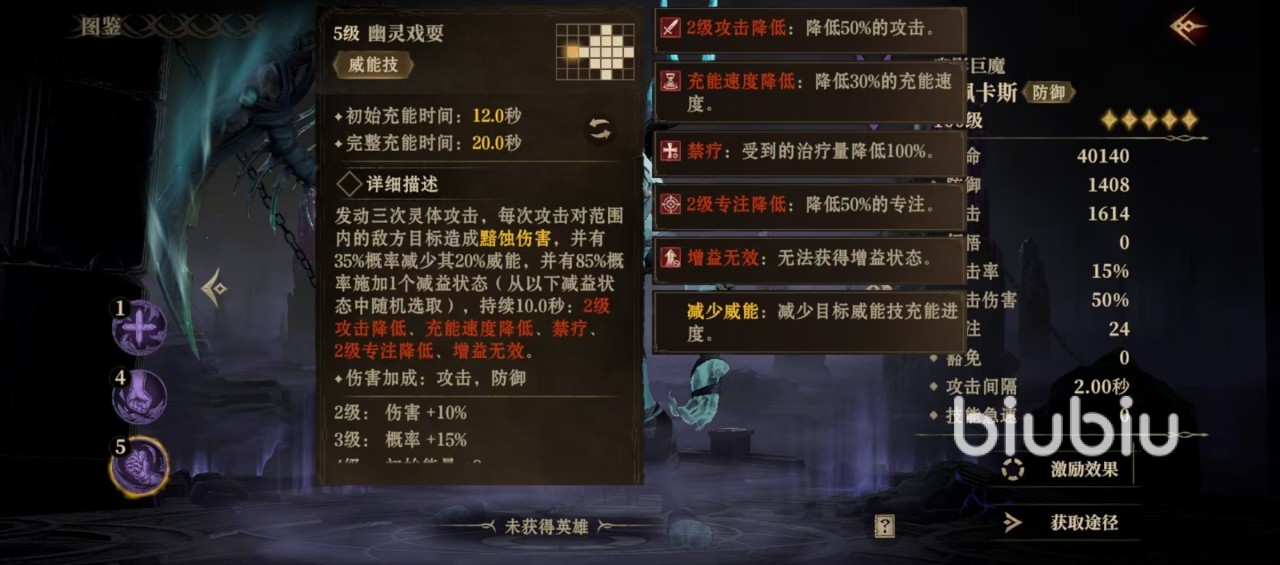 大招幽灵戏耍,施法范围很大,发动三次灵体攻击,对敌方目标造成黯蚀伤害,有35%几率减少对方20%威能。有85%几率施加一个减益状态,该状态并不是固定的,而是随机选择。主要包括二级攻击降低、充能速度降低、禁疗、二级专注降低、增益无效等。这些效果中,二级攻击降低,能削弱对方50%攻击力。充能速度降低,能降低对方30%充能速度。禁疗,是指受到治疗量降低100%。二级专注降低,能消弱50%专注。增益无效,使目标无法获得增益状态。