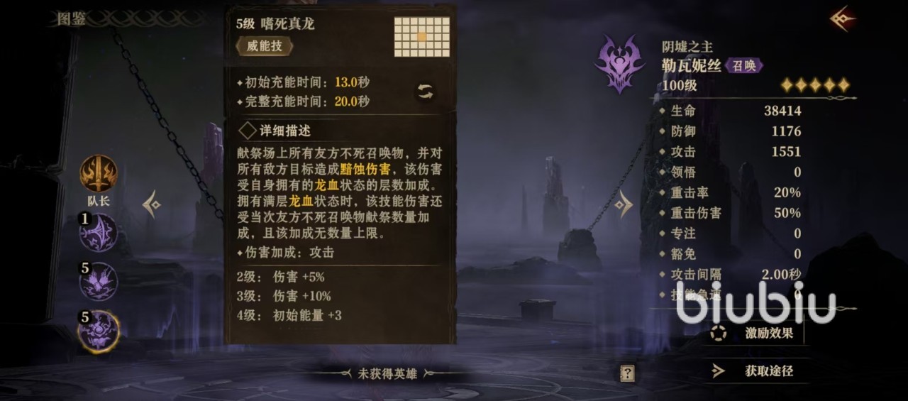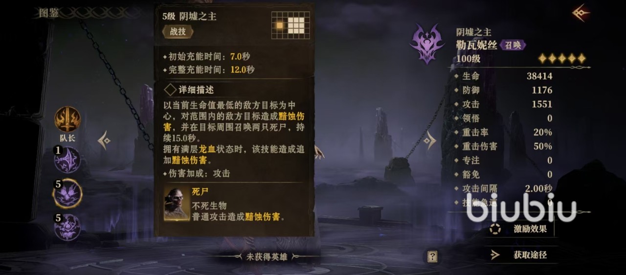 战技效果是选择对方血量最低的为目标,以其为中心造成范围伤害,并在目标周围召唤两只死尸,持续15秒钟,死尸是属于不死生物。大招嗜死真龙,将场上的所有己方的不死召唤物全部献祭掉,对敌方目标造成高额伤害,该伤害受自身拥有的龙血层数加成影响,如果拥有满层龙血,该技能伤害还能受己方不死召唤物献祭数量的加成,加成数量无上限。