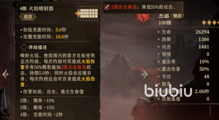 然后是战技:火焰喷射器:使用了这个技能,杰恩会释放火焰并进行喷射,对范围内的敌方目标造成五次灼烧伤害,每次灼烧造成50%攻击力和2%最大生命值的火焰伤害,并有50%概率施加2级攻击降低状态,持续5秒。同时,火焰会反噬自身,每次灼烧还会对自身造成20%攻击力和0.8%最大生命值的火焰伤害,同样的,技能可以升级。到2级的时候攻击力会降低:降低50%的攻击。然后是威能技:独家炸弹。这个技能会使得杰恩对范围内的敌方目标造成500%攻击力和10%最大生命值的火焰伤害,并减少其25%威能,并有75%概率移除其所有增益状态。这个技能有独特的伤害加成,主要作用于:攻击方面,以及对最大生命值的增益。