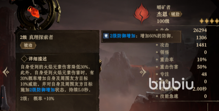 下面是杰恩的技能解析:首先我们需要知道杰恩的技能组合使其在队伍中扮演着重要的辅助角色,因此我们需要逐个的了解它的每一个技能,并争取做的详细掌握。最开始是被动技能:真理探索者:杰恩的被动技能使其在受到火焰元素伤害时,降低30%的伤害。此外,每当受到火焰伤害时,有30%的概率为自身及周围友方目标提供10%的威能加成,并施加2级防御增加状态,持续5秒,2级时防御会增加:增加60%的防御。
