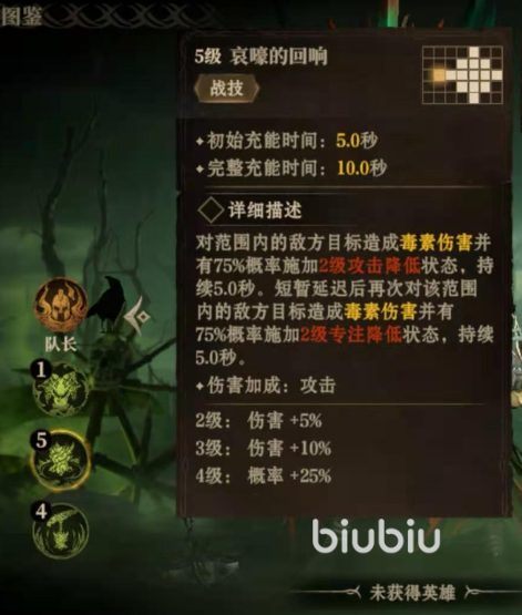 ③哀嚎的回响,可以对范围内的敌方目标造成毒素伤害,并有75%的概率施加2级攻击降低状态和2级专注降低状态,持续5秒。短暂延迟后,她再次对该范围内的敌方目标造成毒素伤害,并有可能进一步施加减益状态。这一技能不仅直接造成伤害,还能有效削弱敌人的攻击力和专注属性。④女王的惩罚舍得威能技初始充能时间为12秒,完整充能时间为20秒。在技能释放时,她能够移除所有友方目标身上的所有减益状态,并施加2级防御增加状态,持续10秒。同时,她还会将所有敌方目标身上的所有减益状态的持续时间延长5秒。这一技能在关键时刻能够为队伍提供强大的防御和辅助效果,同时进一步削弱敌人。
