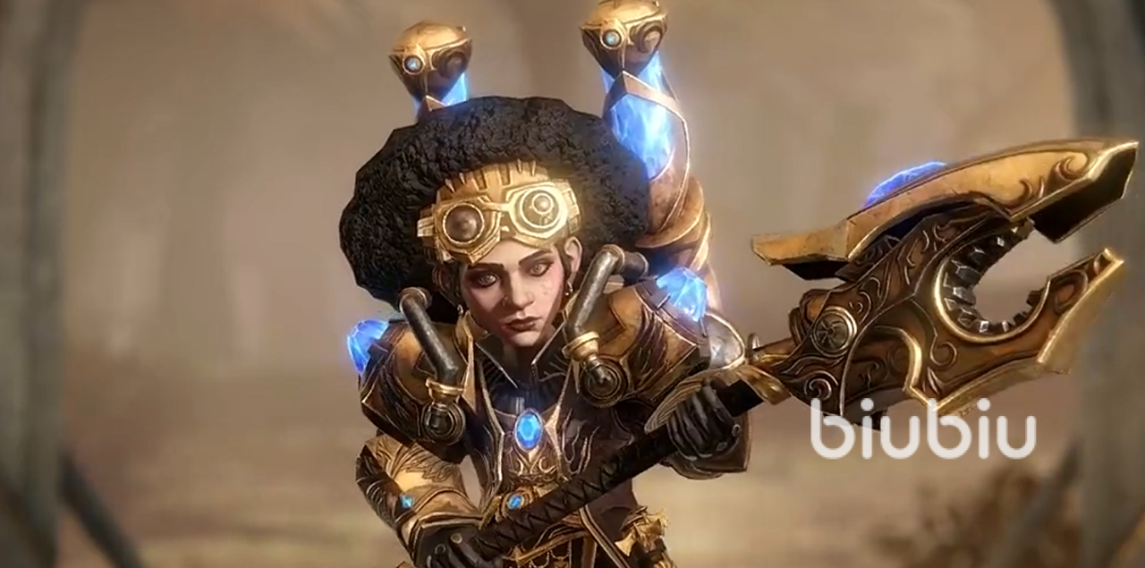 唐妮拉被定位为一位辅助角色,他的形象非常有特色,他身着一套金色与蓝色相间的华丽盔甲,彰显出非凡的气质与力量。同时头饰两侧还延伸出两根突出的蓝色能量棒,宛如两道闪电划破长空,不仅增添了角色的神秘感,更暗示着他拥有操控能量的非凡能力。法杖作为他的主要武器,但实际上在战斗中她更倾向于近战。