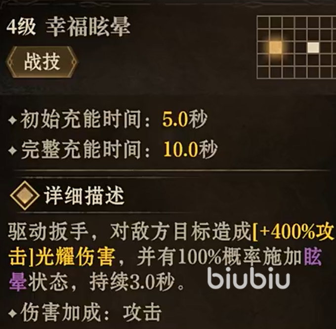 ③群体降低专注和攻击这一技能,能够在眩晕效果结算时,敌人还会获得一层伤害降低的debuff,同时降低其专注和攻击力,进一步削弱敌人的战斗能力。这种技能组合不仅使得唐妮拉在辅助方面表现出色,也让她在坦克角色中有一定的地位,因为她能够吸收伤害并保护队友。