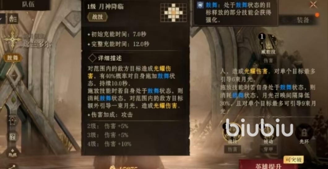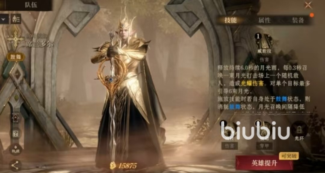 首先他的攻击光环在地下城战斗当中提升了所有有方目标45%的攻击,他的被动技能是自身消耗鼓舞进行技能施法的时候,这次技能的伤害可以无视目标20%的防御。他的技能月神降临,可以对范围内的敌人目标造成光耀伤害,有40%的概率对自身世嘉鼓舞,状态持续十秒钟。而且放技能的时候若自身处于鼓舞状态,会消耗鼓舞的状态对范围内的敌方目标额外引导一束月光。他的月神惩戒技能会释放六秒钟的月光女,这样每0.3秒之后会召唤一束月光打击场上一个随机的敌方目标,造成光耀伤害。而且对单个目标最多引导六束月光释放的技能,若自身处于鼓舞状态,月光也会间隔降低30%。