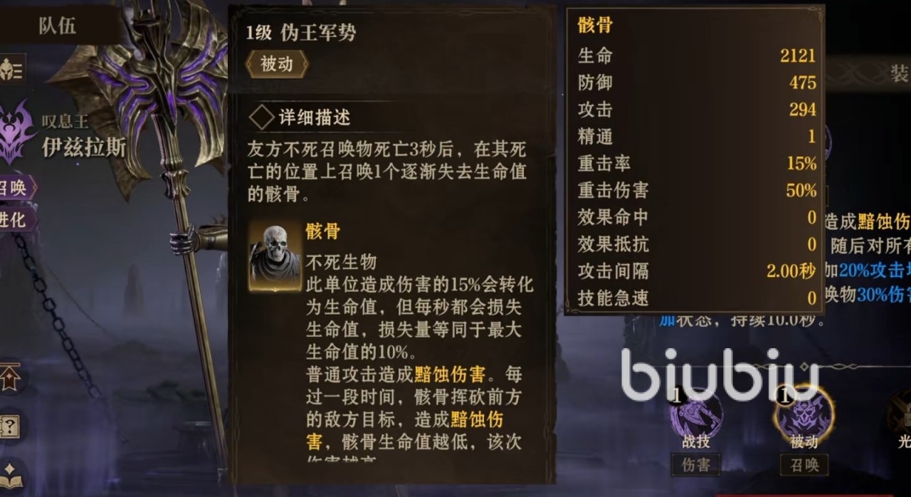 伪王军势是这个角色的被动技,当己方的不死召唤物死亡3秒后,在其死亡的位置上,会重新召唤1个逐渐失去生命值的骸骨。骸骨不死生物造成的伤害,会按比例转化为生命值,不过骸骨每秒都会损失生命值,损失量等同于最大生命值的10%,不断出现的骸骨可以分担你的防御压力,还能对敌方造成一定的威胁。