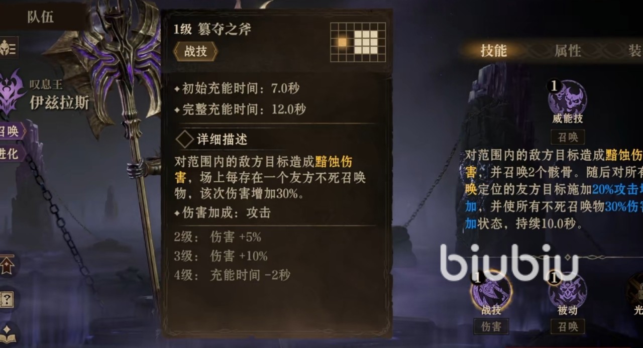伊兹拉斯的战技叫做篡夺之斧,能够对范围内的敌方目标造成黯蚀伤害,场上每存在一个友方不死召唤物,该次伤害增加 20%,在有较多不死召唤物在场时,战技的伤害会得到显著提升,具备较高的爆发输出潜力。它的威能技是叹息王座,释放这个技能,能对范围内的敌人造成黯蚀伤害,并召唤2个骸骨。随后对所有召唤定位的友方目标施加20%攻击增加状态,这个大招既能造成高额的群体伤害,又能为友方召唤物提供攻击加成,进一步提升队伍的输出能力。