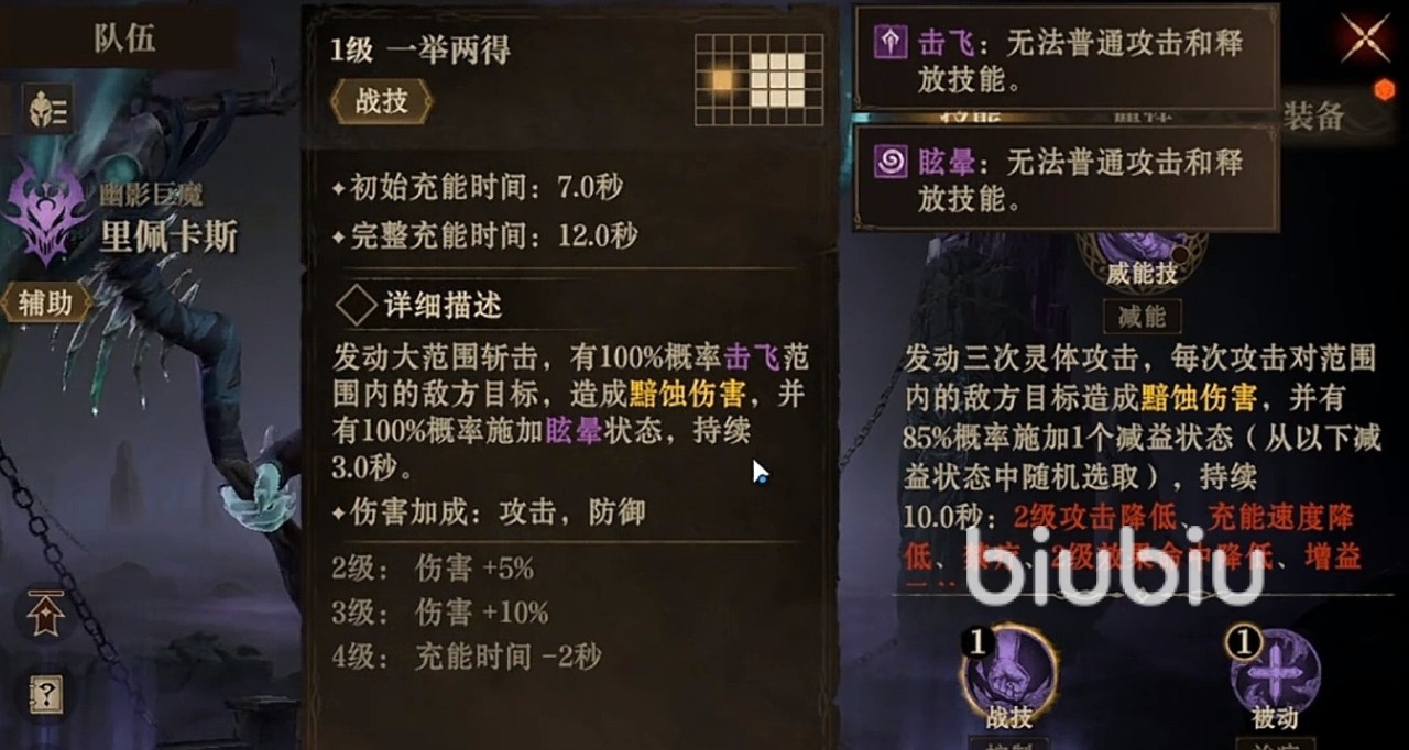 除了被动技外,里佩卡斯还拥有一举两得这个战技,可以发动大范围斩击,有100%的概率击飞范围内的敌方目标,并造成基于攻击力和防御力加成的黯蚀伤害。此外,还有100%的概率施加眩晕状态,持续3秒,实际的效果会随着技能等级提升。该技能还具有一些特殊的附加效果,能在一定程度上增加角色的战力。它的威能技幽灵戏耍,使用时会发动三次灵体攻击,每次攻击对范围内的敌方目标造成黯蚀伤害,同时有35%的概率减少目标的威能,并且有85%的概率施加一个减益状态。