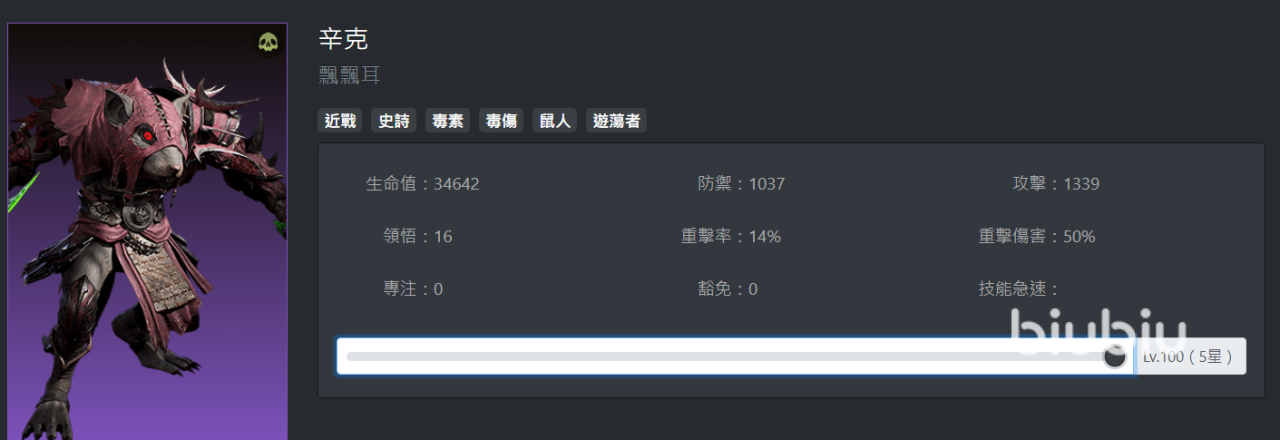 辛克作为鼠人游荡者,不仅精通毒术,还因其史诗的稀有度,成为平民玩家轻松获取的强力选择。通过太阳季轮替召唤卡池,玩家可以较容易地抽取并培养这名角色。在满星100级时,辛克的基础属性为:生命值34642、领悟16、防御1037、重击率14%、攻击力1339、重击伤害50%。
