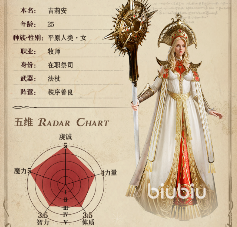 明光牧师的本命叫做吉莉安,是一名牧师职业,使用法杖的武器,主要作用就是给队友提供治疗和增益,是队伍中不可缺少的奶妈,非常核心的英雄。被动”维生术”,她会对生命值低于一定比例的队友进行治疗,并且在治疗时给该友方施加1层持续回复状态,能持续一段时间。,该被动搭配战技选取当前生命值最低的友方治疗的机制,能及时的将陷入到危机的友方给到支援效果。