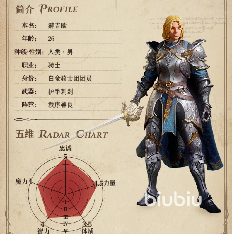 这是一名骑士职业的角色,五维属性都达到4点以上,属性发展相当的全面,是个各方面均衡发展的英雄,在战斗中的适用性很高,能力也非常的出色。被动”骑士精神”,在威能技释放后,有一定概率对随机的1个己方对手施加鼓舞状态,并持续一段时间,该效果让他在鼓舞阵容里面有比纯粹的输出英雄更为丰富的功能。