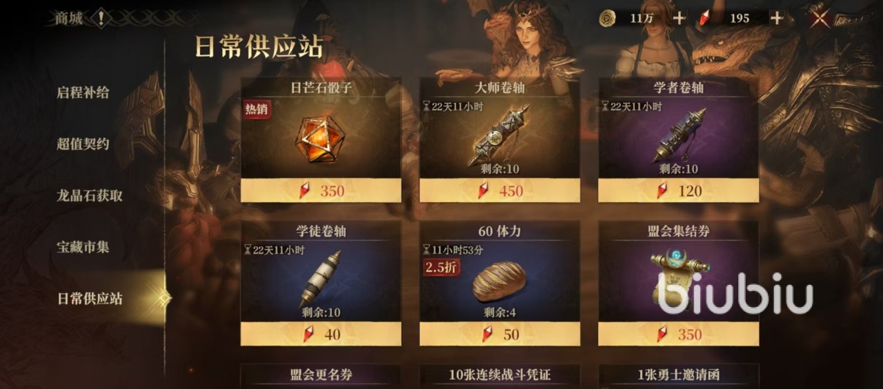而其他充值所获取到的龙晶石,就是在商城中购买各种道具,首先是每个赛季的启程补给都要买下来,因为启程礼包赠送的都是赛季比较强势的英雄,还有大量日芒石骰子等抽卡道具,这也是性价比很高的礼包。在日常供应站中,需要消耗部分龙髓石来购买体力,连续战斗凭证以及金币等,这也是游戏中很重要的资源,龙髓石不够就拿龙晶石去换,这也是不能缺少的。