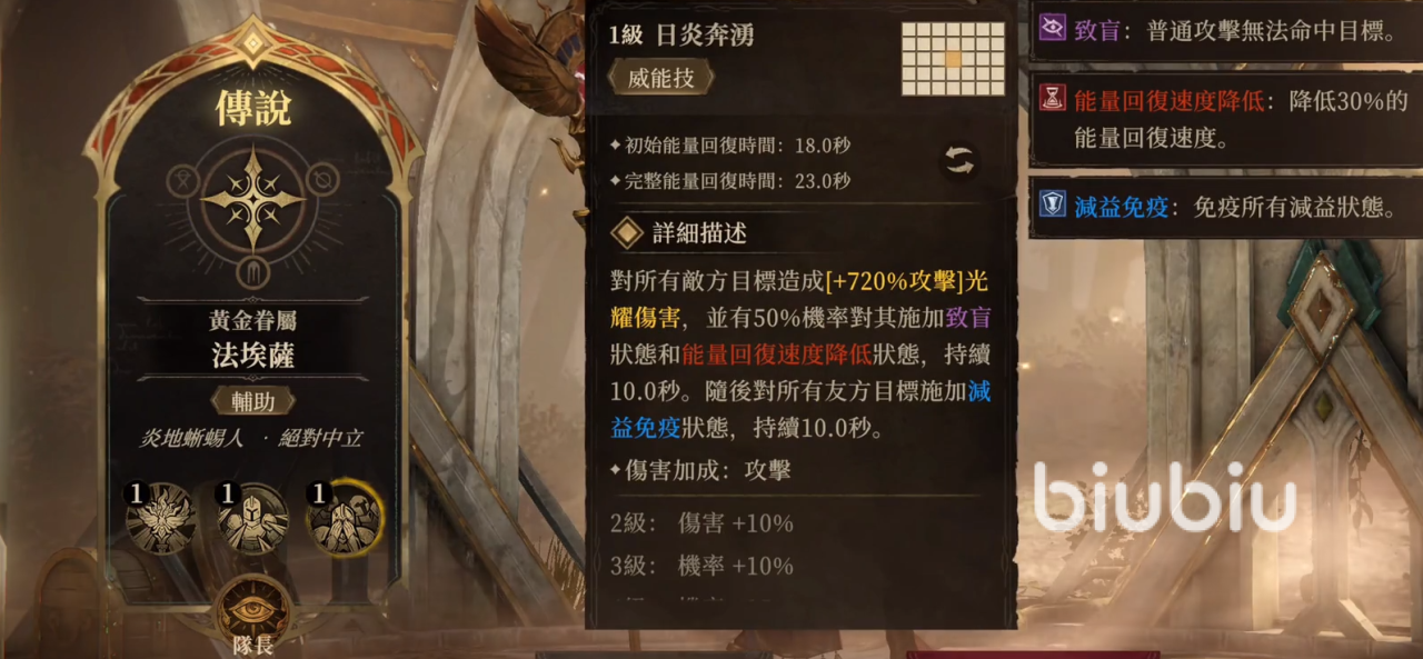 效果:所有友方目标施加任意状态效果的成功率提升20%,同时降低所有敌方目标施加状态效果的成功率20%。此效果在法埃萨死亡后依然有效。