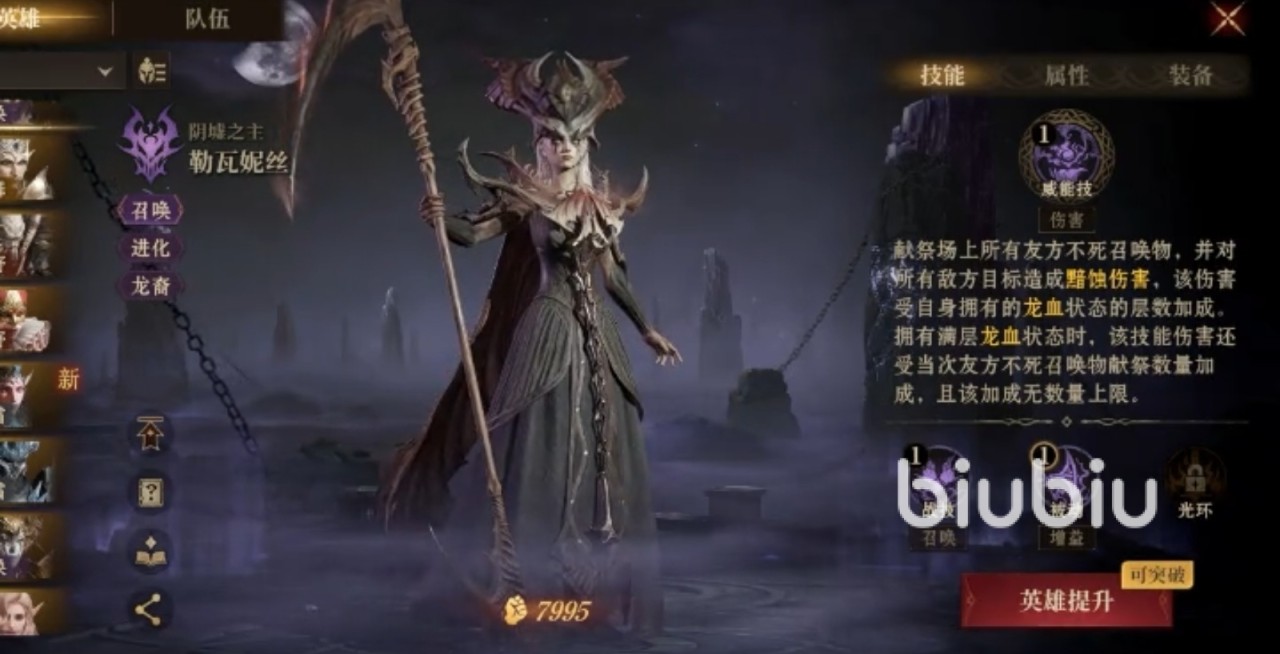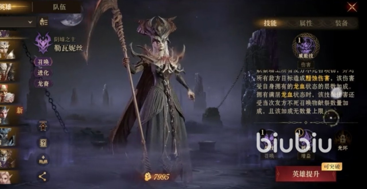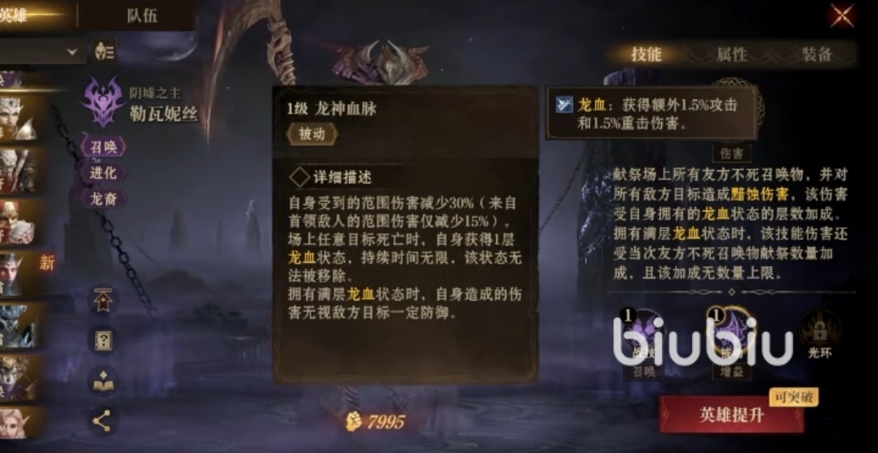 聊完了勒瓦妮丝的特点,小编再给大家讲一讲该英雄的技能,勒瓦妮丝的队长技是重击伤害光环,当你在大角斗场中战斗时,可提升所有友方目标45%重击伤害。被动技龙神血脉,能减少自身受到的范围伤害,场上任意目标死亡时,它还能获得1层龙血状态,持续时间无限,该状态无法被移除,最多能叠20层。勒瓦妮丝的战技阴墟之主,会以生命值最低的敌方目标为中心,对范围内的敌方目标造成黯蚀伤害,并在目标周围召唤两只死尸,整个过程会持续15秒。它的威能技嗜死真龙,会献祭场上所有友方不死召唤物,并对所有敌方目标造成黯蚀伤害。