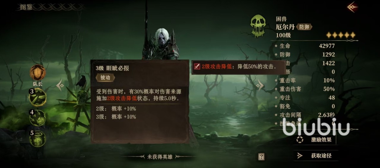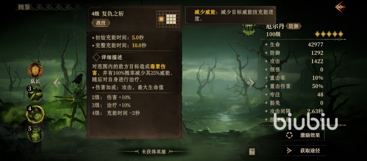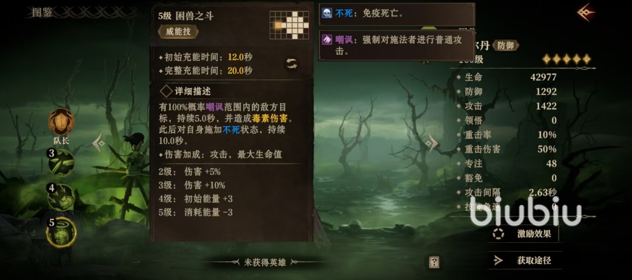 战技复仇之战,对范围内的敌方目标造成毒素伤害,有100%几率减少其25%威能,随后对自身进行治疗。该技能伤害范围比较大,毒素伤害虽然并不多,但是降低威能可以大大削弱对方,释放威能技的节奏,所以对敌方多个目标都是很好的限制,还有恢复自身血量的能力加强生存。威能技困兽之斗,100%概率嘲讽范围内的敌方目标,持续5秒钟,并造成毒素伤害,此后自身施加不死状态,持续10秒。不死可以在持续时间内免疫死亡,嘲讽可使对方强制进行普通攻击。