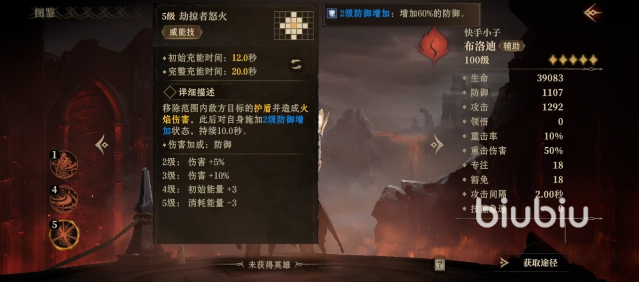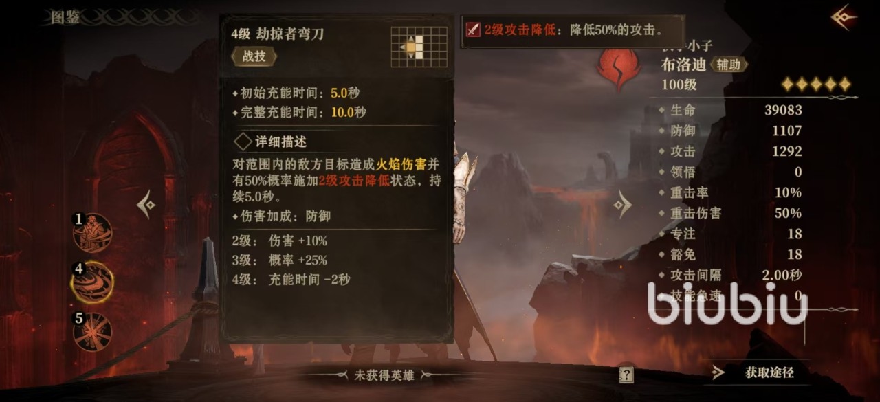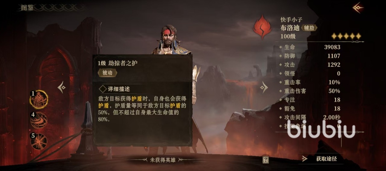 布洛迪具有一个被动技能劫掠者之护,每当敌方目标获得护盾时,自身也会获得护盾,护盾的相当于敌方目标护盾的50%,但是也存在上限,不超过自身最大生命值的80%。这一被动效果就非常适合来面对频繁施加护盾的敌方目标,这样自身可经常带有护盾,大大提高了生存能力。战技劫掠者弯刀,选中范围内的敌方目标,并造成火焰伤害,有50%概率施加二级攻击降低状态,持续5秒钟,二级攻击降低能够削弱对方50%的攻击,该技能削弱起来非常出色,但是范围有些近,这也是该技能的缺点之一。