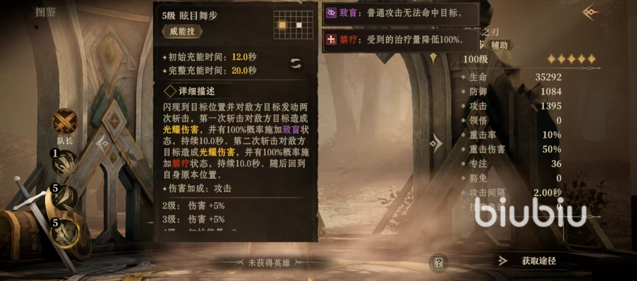 战技暮色斩击,投掷出一把匕首,对敌方目标施加二级攻击降低状态,持续5秒钟。随后直接冲到目标身边,发动一次斩击,造成光耀伤害。二级攻击降低能够降低目标50%攻击力,这一效果的影响还是非常大的,直接废掉了对方的一个输出目标,而且是属于点对点释放的技能,有一定针对性。威能技能炫目舞步,闪现到目标位置,对敌方目标发动两次斩击,第1次造成光耀伤害,100%几率施加致盲,持续10秒钟。第2次造成光耀伤害,100%几率施加禁疗状态,持续10秒钟,攻击完两次之后回到自身位置。