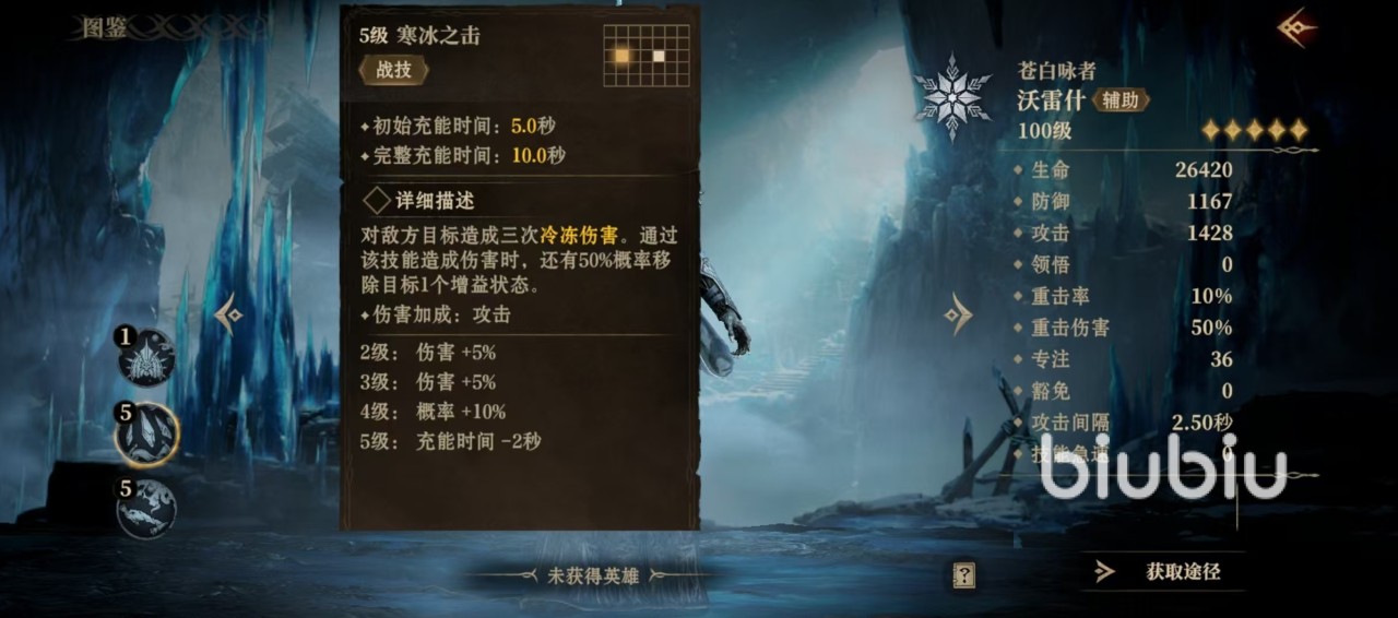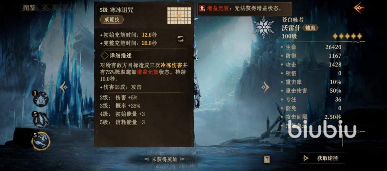 战技寒冰之击,对敌方目标造成连续三次冰冻伤害,通过该技能造成伤害时,还有5%概率将目标身上的一个增益状态移除,这三次伤害基本上可以保证100%移除一个增益,能大大削弱对方,至于消除的是哪一个增益状态则无法判定。威能技寒冰诅咒,对所有的敌方目标造成三次冷冻伤害,并有75%几率施加增益无效状态,持续10秒钟,对方被增益无效状态影响之后,就无法获得增益状态,这对于一些依靠增益来起决定性作用的流派来说,是很重要的削弱,大大延缓了对方的整体强度和节奏。