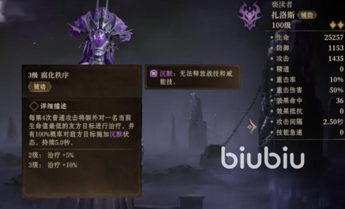 他的被动能在第4次普攻时,额外对一位生命值最低的队友进行一次治疗,并100%对敌人施加沉默,让其无法释放战技和大招,他的战技会对范围内敌人形成380%的黯蚀伤害,并且有75%概率降低其30%的充能速度,他的大招能在指定地点召唤1个持续5秒的囚牢,囚牢存在期间每1秒就会对范围内敌人形成黯蚀输出值,并且有35%概率施加恐惧5秒,让其无法普攻和释放技能,最后对所有队友进行治疗,在这之前每命中1位敌人都会让治疗量增加15%。