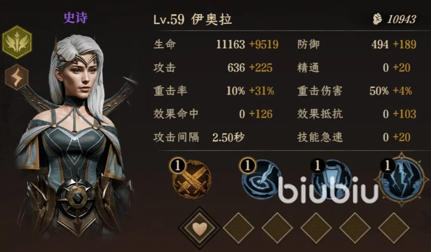 她的被动能在对沉默目标进行攻击时,有40%概率把沉默改成眩晕,她的战技会向敌人发射两个闪电球,每一个形成200%攻击的闪电伤害并且有50%几率施加5秒沉默,她的大招会召唤闪电轰击目标区域3次,每一次都会对范围内敌人形成230%攻击的闪电伤害并且一半概率施加沉默,75%概率施加2级攻击降低10秒。