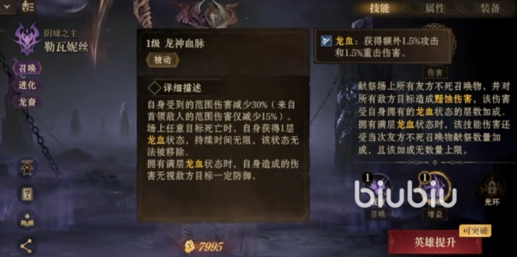 黑龙的被动是拥有龙神的血脉,在场任意单位的死亡都可以为其提供一层龙血,最多能叠到20层,有满层龙血的时候,黑龙的伤害可以无视敌人35%的防御。高额的穿防还是很厉害的,但需要叠到20层的限制时期想要发挥出威力有一定的条件限制。