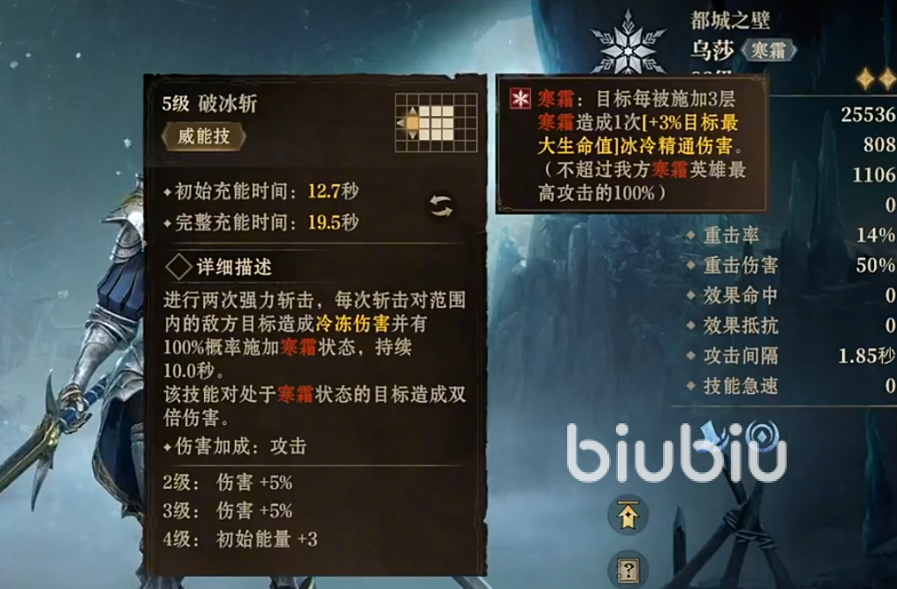 她的威能技非常关键,释放的时候会进行2次强力的斩击,每一次斩击都会对范围内敌人形成400%的冷冻伤害,并100%施加寒霜10秒,该招式在面对已经处于寒霜状态的敌人时会形成双倍的伤害。