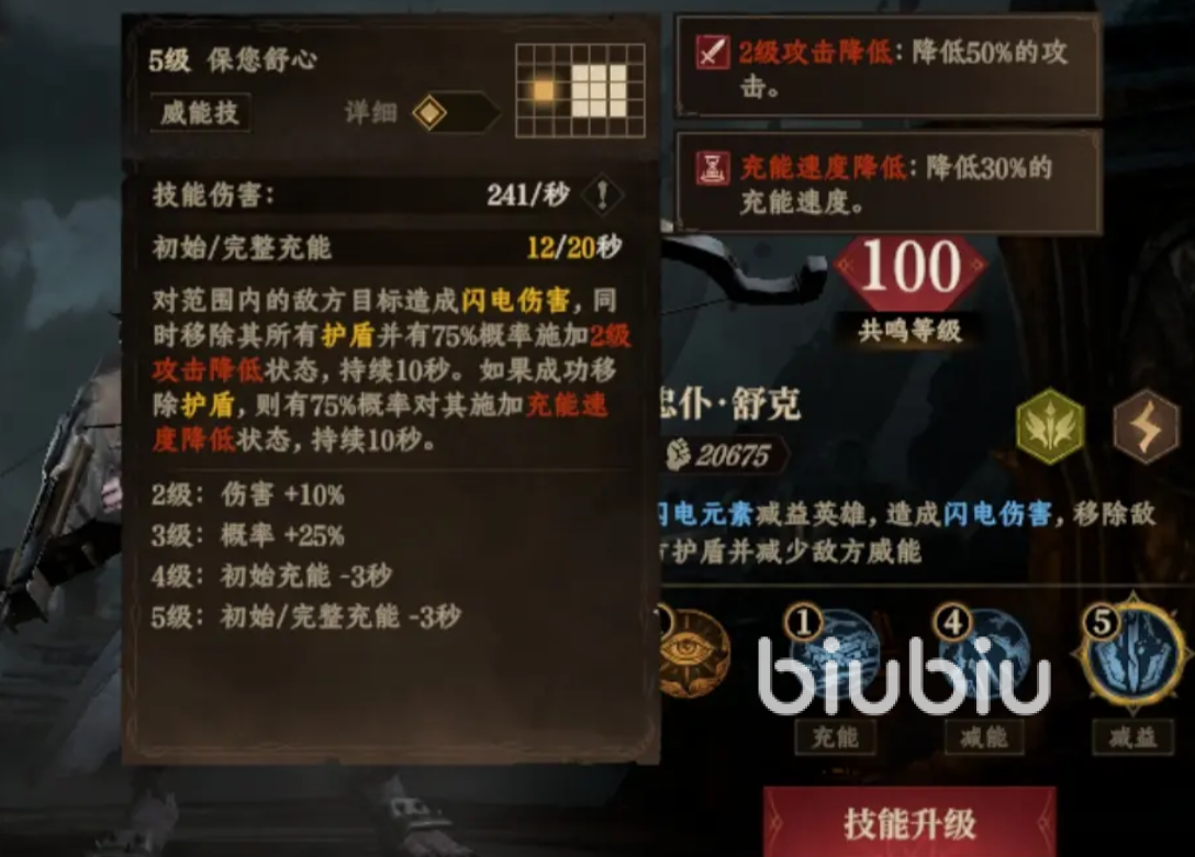 他的威能技会对范围内敌人形成675%闪电伤害,同时移除其所有护盾,并且还有75%的几率降低对手50%的攻击力,持续时间为10秒,如果成功移除掉护盾的话,还有75%概率让对手降低30%的充能速度。