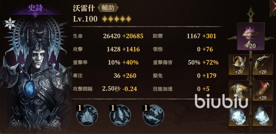 如果装备允许,建议前排三人的专注值提升到280到300,因为BOSS有随机恐惧技能,控制次数过多真的会影响战斗进程。为了解决这个问题,可以将菲兹替换成了厄玛,这样沃雷什就能避免被控制,还能减伤,不至于在关键时刻因恐惧无法奶人。奥斯特这个角色就纯粹作为输出,因为这里没有角色能帮助寒霜,所以在装备上,已经是极限了,250专注值也是能够满输出的,关键还是要保证重击和重伤效果高于攻击力。