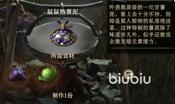它的外表看上去黑漆漆的,给人感觉非常不妙,但却拥有帮助增强暗属性伤害和效果抵抗的能力,非常适合暗属性英雄,配方是两块甘薯,再拌入两份球甘蓝。