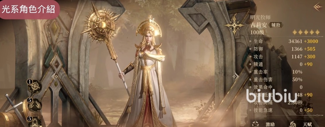 4、光系。这个系列中的“吉利安”,在辅助技能上比较全面,特别是在竞技场上,它能很好的维护住整个队伍的生存能力;“菲儿图”的话就是攻击型辅助,不过要有针对的单体目标。