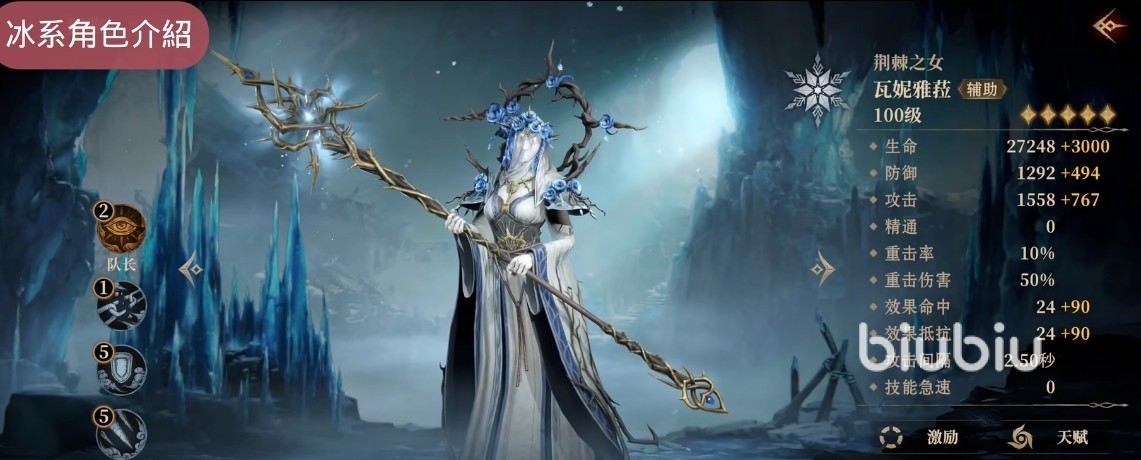2、冰系。这个系列的角色特点是在技能上会有冰冻效果,在角色的传说级别上“荆棘女王·瓦妮”,她的大招能卸掉对方所有的助益卡牌效果,还能减少敌方的威能和攻击能力,可以说是非常好用。但是抽取难度可以说非常之难;“星晨之女·洛希”的话就比较好抽了,在对战上也比较好用,她的光环技能能在所有战斗场景中生效,这个技能特点非常好用。