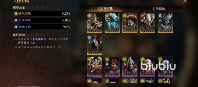 星辉召唤虽然也能抽传说但是概率非常低,而且这里只有6个传说英雄,30抽保底获得史诗英雄,该池子的主要方向还是紫卡。还有一个召唤英雄的方式其实比较容易被大家所忽略,就是营地里的异界号角。