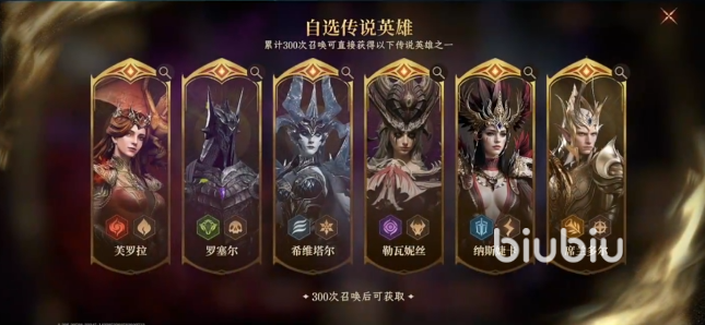 而且到了300抽是能免费获得一个自选的传说英雄宝箱的,在这里就可以选择一个想要的传说英雄,日芒这个卡池里的英雄更加全面,包含了所有英雄,两个奖池都是70抽保底出英雄,比较建议朋友们前期抽输出池子,凑到300抽就能拿一个强力的输出。