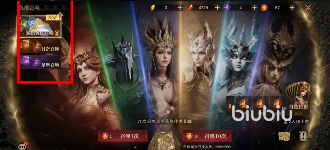 可以大致区分为两种情况,一种是召唤获得,另一种则是非召唤获得了,召唤就是在抽卡系统当中抽卡,英雄的召唤分为输出英雄的召唤,日芒和星辉两个池子,这三个当中都可以获取传说角色,如果大家是比较缺输出型的传说英雄,那么可以下输出召唤这个池子,概率相对来说是提升一些的,大于其他的传说英雄。