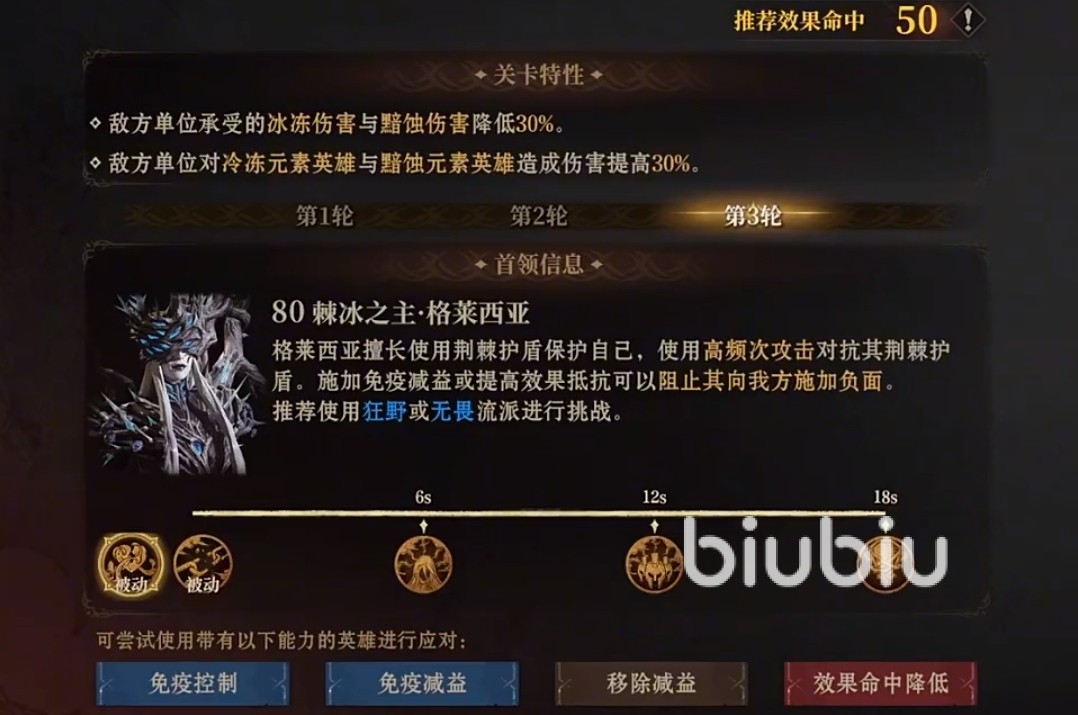 玩家挑战的时候,小编建议是可优先选择阿西莉亚、吉莉安、恩狄等能移除減益效果的英雄,在棘冰之主施加护盾时,使用吉莉安驱散队友身上负面效果,集中火力破除护盾,然后再正常输出就可以了。