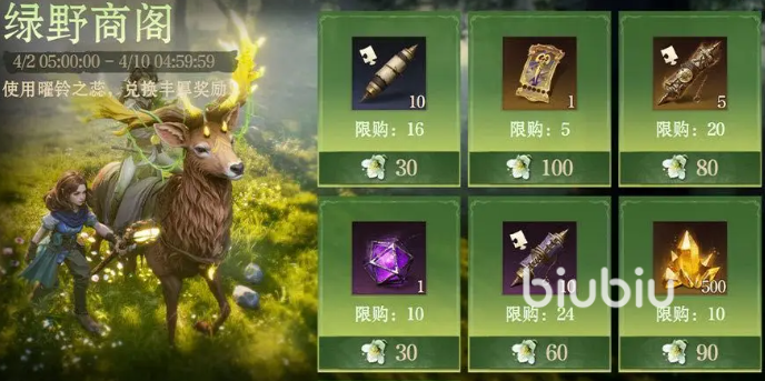 接着是绿野商阁,大家从签到和任务中获得的“曜铃之蕊”,可以在其中兑换各种技能卷轴、造物精粹、外观抽奖券等等丰厚奖励,不过需要注意在4月9号的5点后只会开放绿野商阁兑换,逾期还没有兑换的“曜铃之蕊”会直接失效。