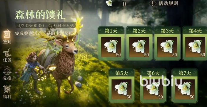 想要参与活动可以点击福利活动,找到聆风奇旅进入,聆风奇旅首先在4月2号到4月9号期间会开启森林的馈礼签到活动,大家只要每天进行签到就能直接领取到50枚“曜铃之蕊”,总共七天能领取350枚。