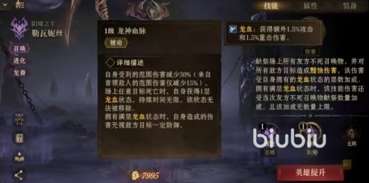 那么首先它的被动技能是拥有龙神的血脉,场上任意单位死亡,可以为其提供一层龙血最多是20层,而且满层龙血的时候伤害可无视敌人35%的防御。他的战斗机能可以以敌方血量最低目标为中心,对于周围类的敌人造成暗属性的伤害,并且能够召唤两个死尸持续15秒。而且他的战斗技能还可以追加伤害,这样就可以增加更大的伤害几率。