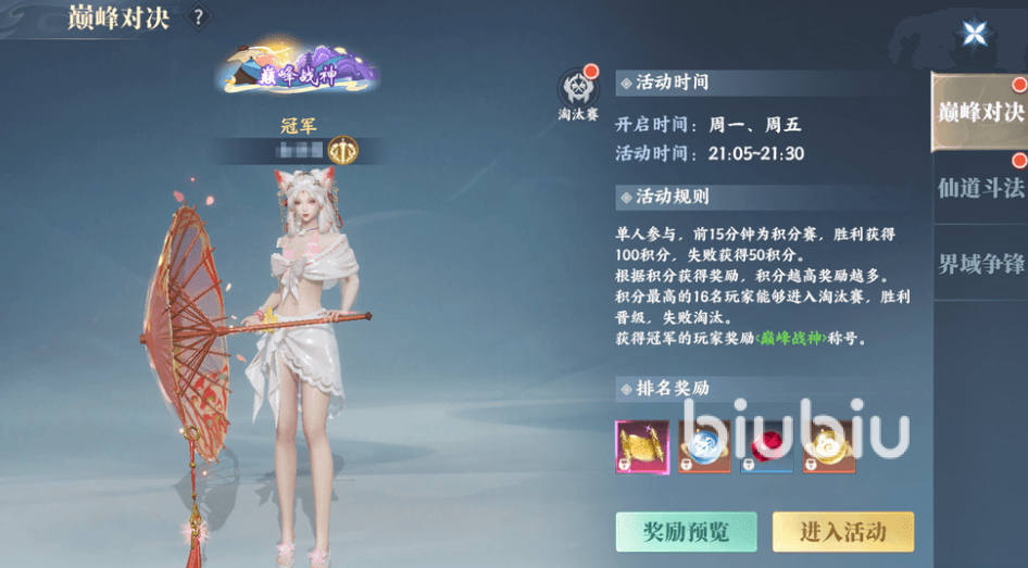挑战对手胜利后会直接拿到奖励以及积分,失败的对手会损失部分积分,最后按照积分进行排名后,每日会通过排名来发放奖励,赛季结算时还会再发一次赛季奖,“巅峰对决”会在每周一、周五的21.05到21.30开启。