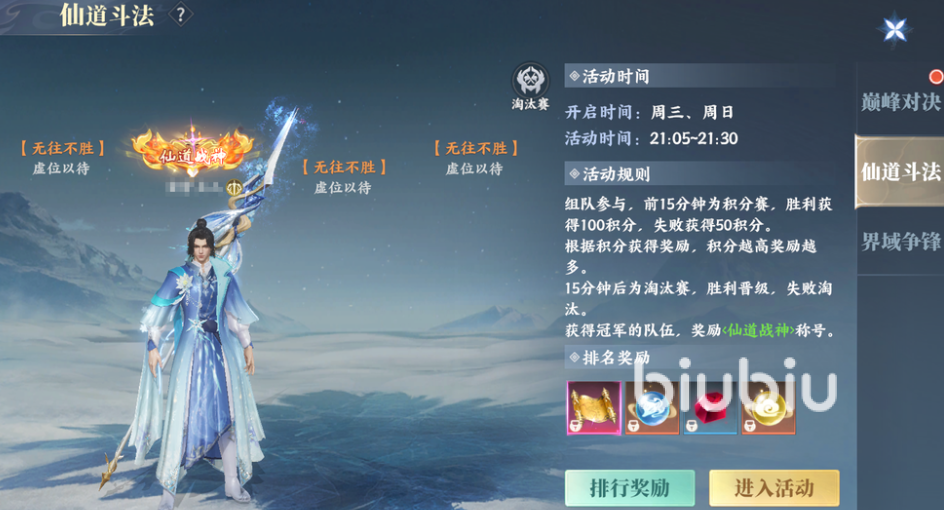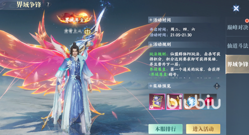 “仙道斗法”是周三、周五的21.05到21.30开启,需要组队参与,规则同样前15分钟是积分赛根据积分来获取奖励,后15分钟开启淘汰赛最终胜利的队伍能拿到“仙道战神”称号,“界域争锋”在每周二、周四、周六开启,属于群体PK玩法,击杀敌人能拿到积分,积分达要求可以晋升到下一层,第一个通关的能拿到“界域尊皇”称号。