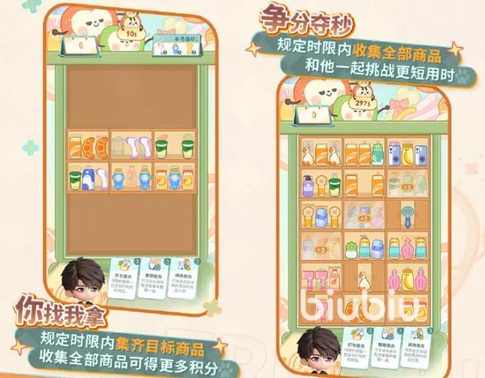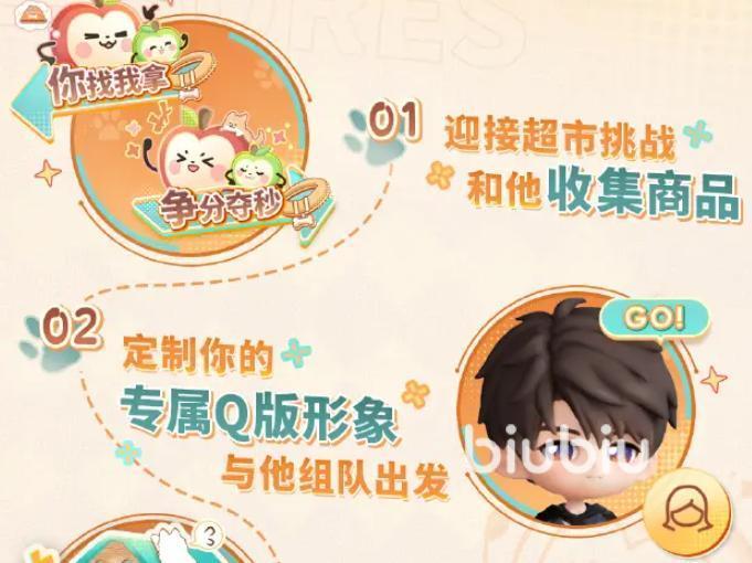 先是和夏以昼一起整理货架,然后完成超市挑战,收集商品。然后是定制专属Q版形象,和夏以昼一起组队。再就是体验活动专属剧情,一起携手挑战宠物救助公益赛事。