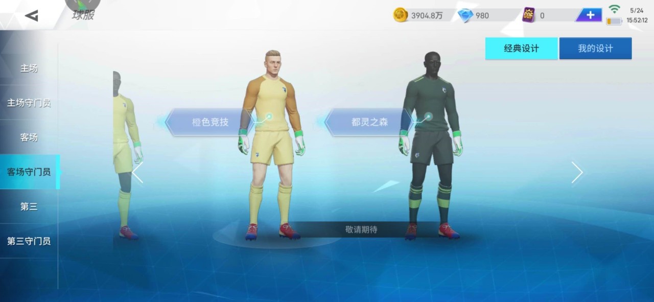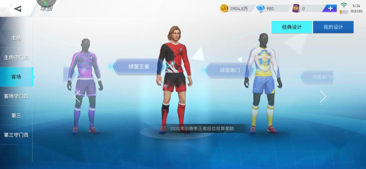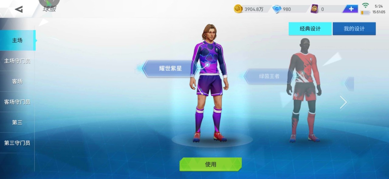 点击【经典设计】然后可以滑动待选球衣进行左右滑动,来选定自己喜欢的球衣。主场,小编选中了耀世紫星这款球衣。名字挺霸气的,而且整体设计也透出一股贵气。选择确定后,球队主场比赛就会使用这款球衣。