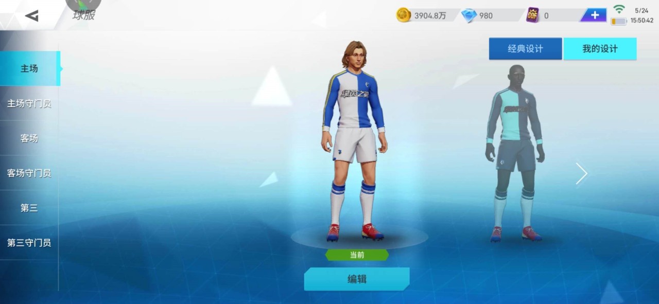 我们首先选中【主场】进行主场球服定制。每个场景都分经典设计和我的设计两类,小编偏向于经典设计类型,因为觉得设计的球服更好看。