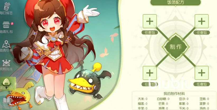 “饭团工坊”是利用饭团制作材料的地方,在活动期间就能看到饭团工坊页面,我们可以在其中放入任意获得的材料,再加入必备材料大米和白砂糖,就能解锁出不同饭团。