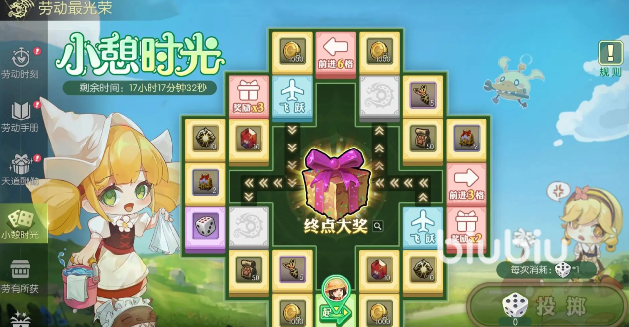 最后通过任务获得的骰子,大家能参与到大富翁玩法之中,规则也很简单只要消耗骰子就可投掷点数,根据投掷的点数能走到对应的各自格子上,格子上会有不同的奖励,完成一圈还能获得终点大奖,劳动纪念券,这个券可以前往商店兑换稀有资源。