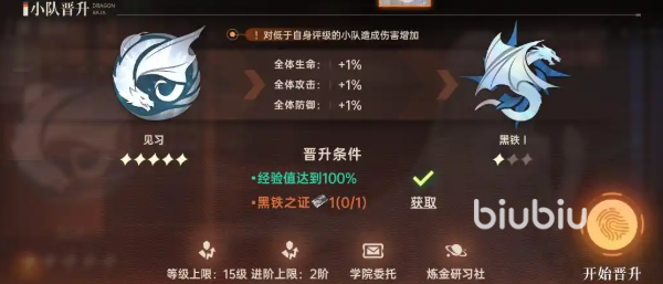 点击在主界面右侧中心的菱形按钮就可以进入小队评级之中,小队队伍评级功能中,共计分为评级提升、炼金研习社和学院委托三个部分,在游戏游玩过程中,几乎大部分玩法都是能帮助累积历练经验,比方说历练经验、主线剧情等等。