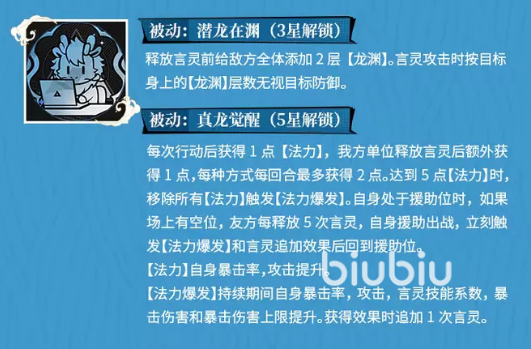 他的3星被动会在使用言灵前给全部敌人添加2层“龙渊”,言灵攻击按目标身上的“龙渊”层数来无视防御,他的5星被动能在每次行动后得到1点法力,达到5点触发法力爆发,法力会让自己的暴击率攻击提升,爆发持续期间自身暴击率、攻击、言灵技能系数、暴击伤害都上升,获得效果时追加一次言灵。