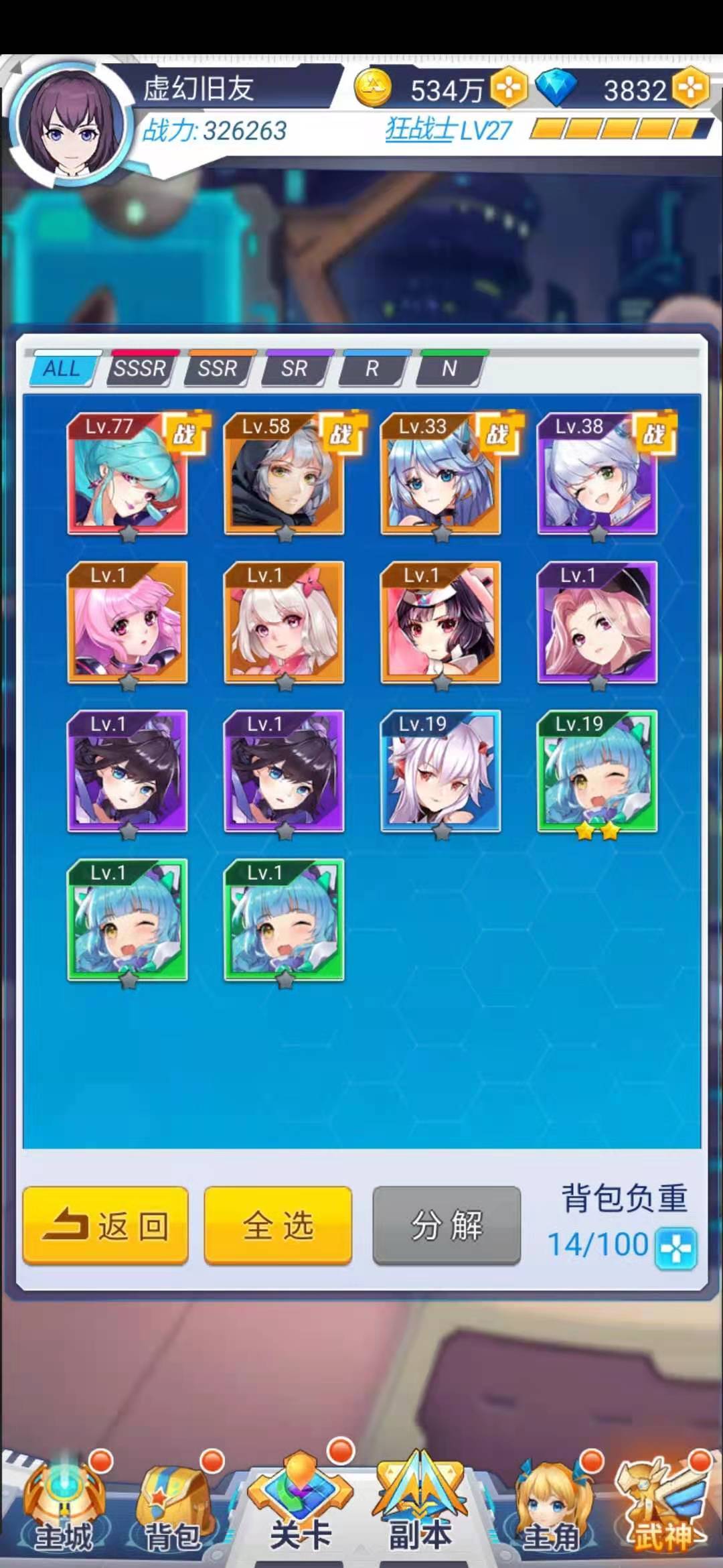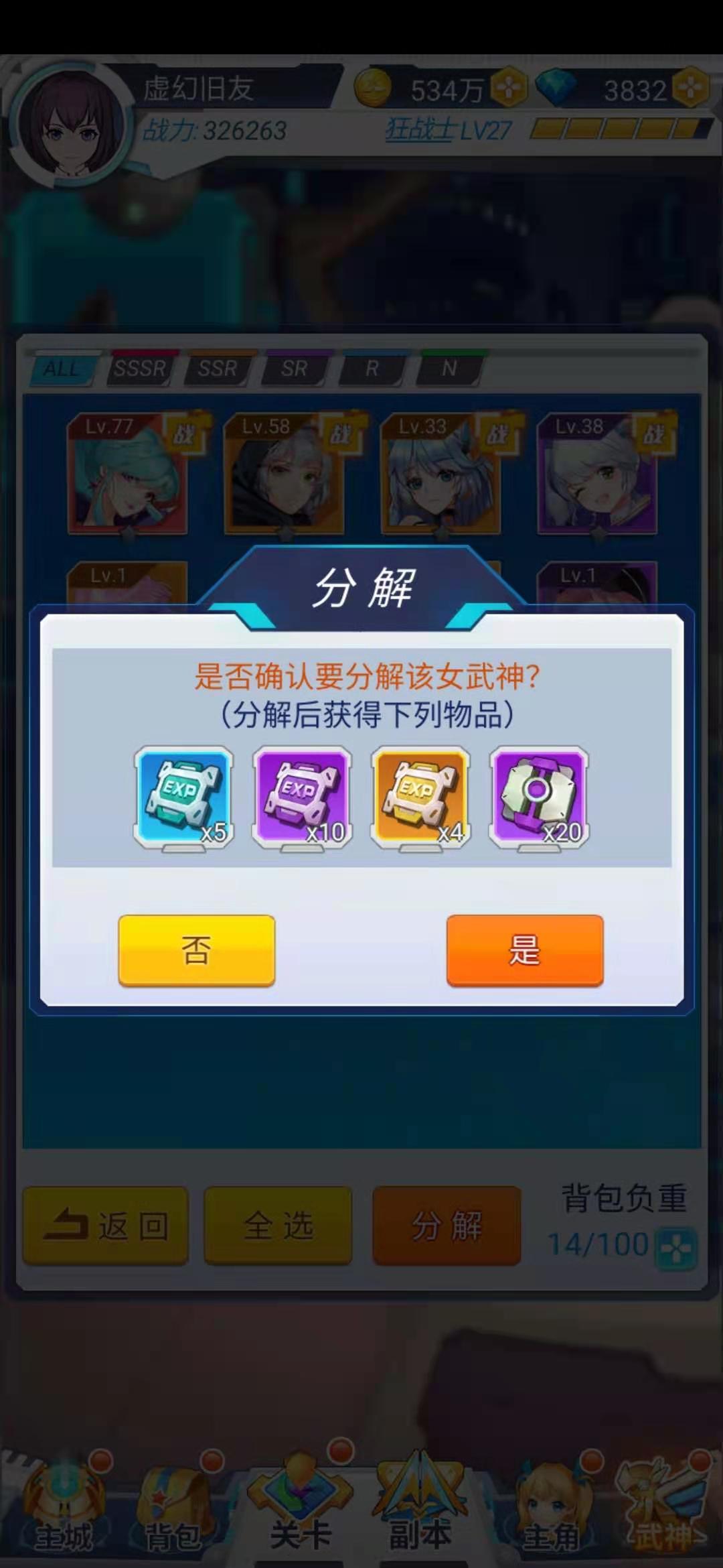 有了大量英雄之后,我们会发现有很多用不上的英雄,这时可以选择分解。然后,我们进入游戏页面,然后寻找武神这个选项,接着点进去。点进去之后我们可以看到一大堆英雄,有的已经上阵的英雄,我们就无法分解了。若是想要分解上阵英雄的话,就先要把她给取下来才能够分解。若是想要分解其他英雄的话,我们点击右下角的分解这两个字。