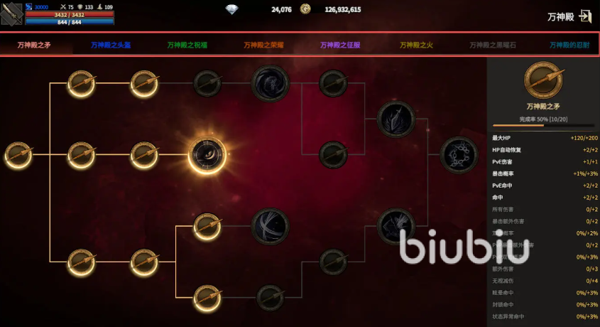 万神殿这个系统主要是针对全体英雄的基础属性,比如说血量、攻击力和防御力等,另外拿满装备套的话,还能在神圣伤害、暴击伤害、吸血、韧性上提供属性加成,相当于从多个方面来提升英雄的战力。另外通过刷各类副本解锁了专属的技能槽之后,还能点亮专属技能,比如说万福神殿,在提升战力之余降低技能cd时间,提高负重等。